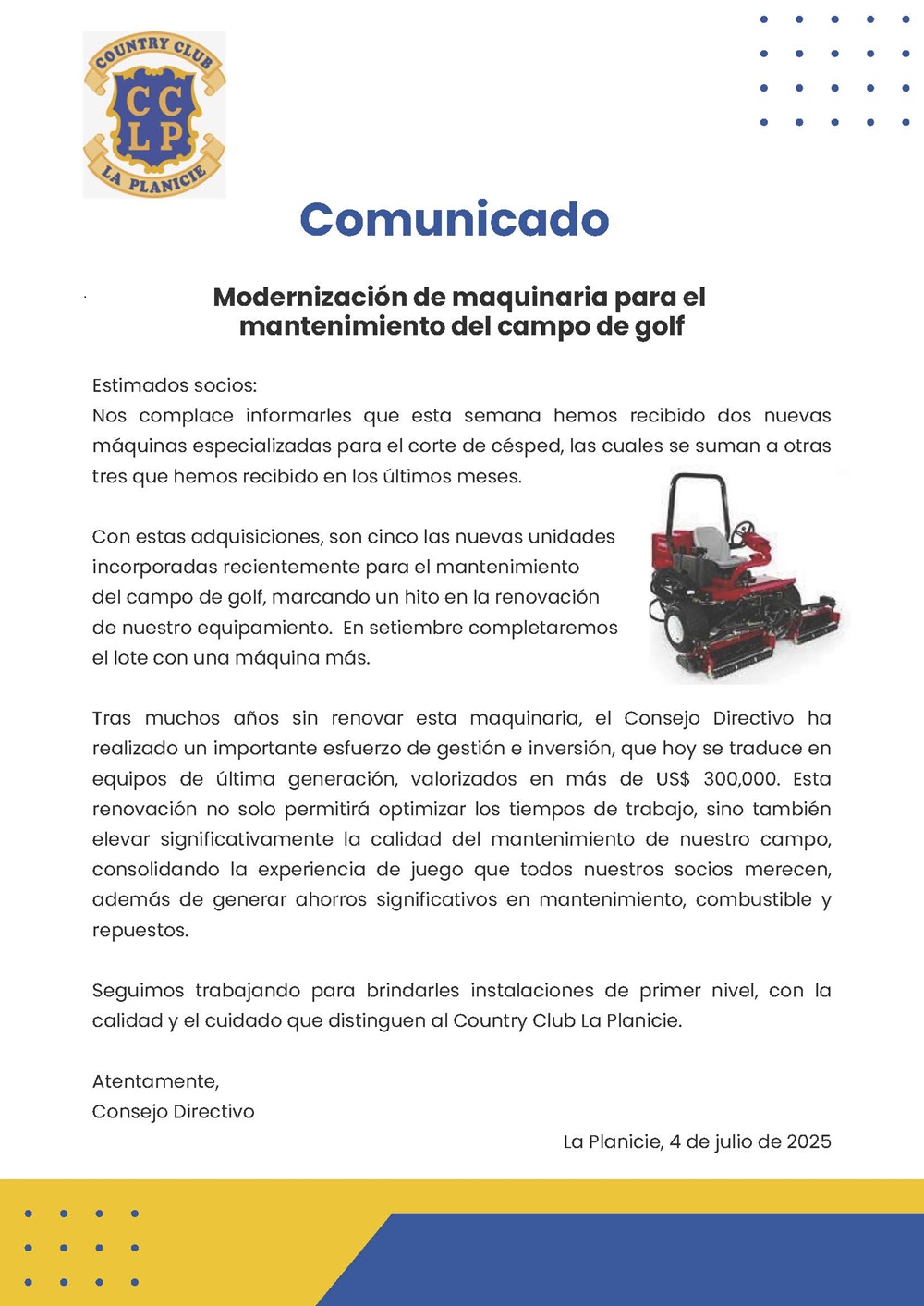 Comunicado | Modernización de maquinaria para el mantenimiento del campo de golf