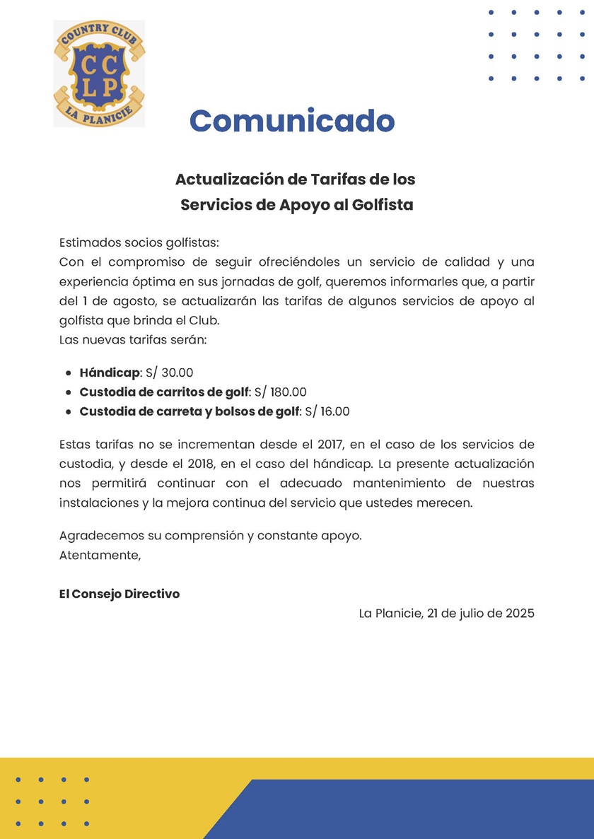 Comunicado | Actualización de tarifas de los servicios de apoyo al Golfista