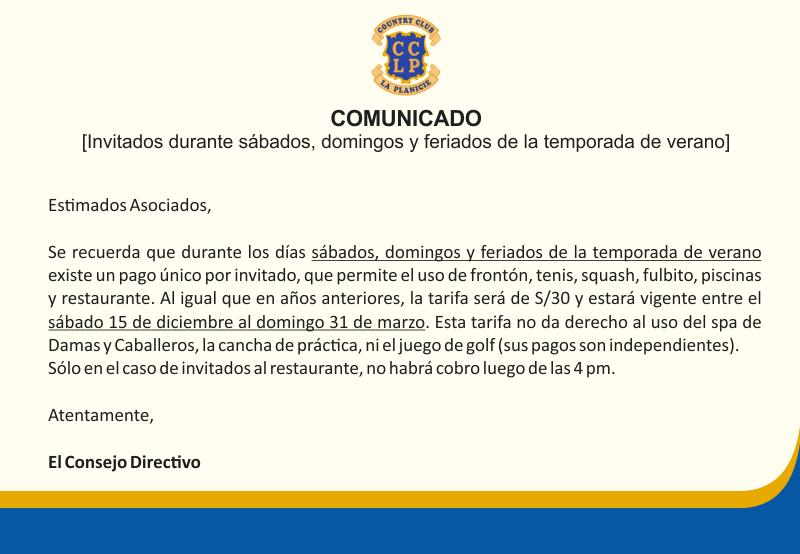 Comunicado | Invitados durante sábados, domingos y feriados de la temporada de verano Anterior Siguiente
