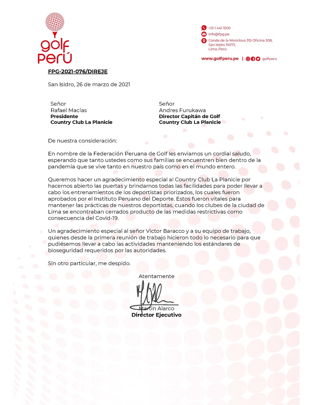 A continuación encontrarán la carta de agradecimiento emitida por la Federación Peruana de Golf por los días del martes 23 de febrero al viernes 12 de marzo, fechas en que el club fue sede de entrenamiento de deportistas priorizados.