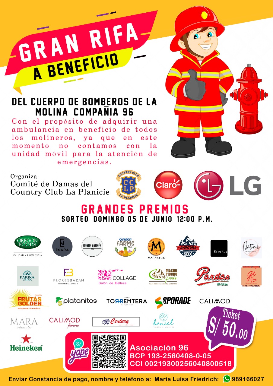 Quedan todos cordialmente invitados al evento en Beneficio de la Compañía de Bomberos de La Molina con el propósito de adquirir una Ambulancia, a realizarse en nuestras instalaciones:
