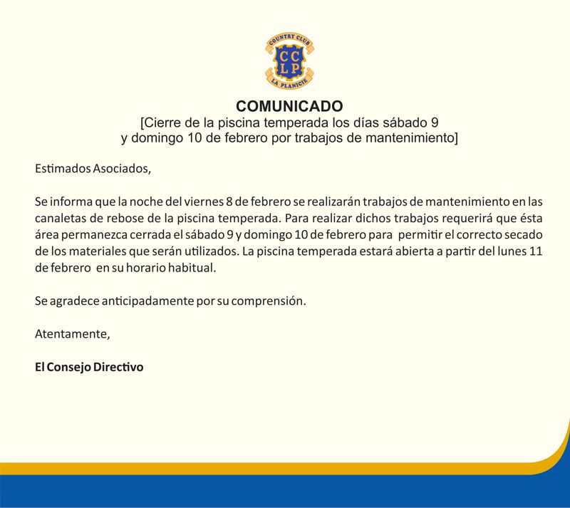 Comunicado | Cierre de la piscina temperada los días sábado 9 y domingo 10 de febrero por trabajos de mantenimiento Anterior Siguiente