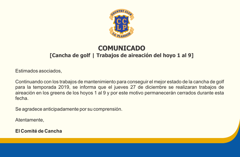 Comunicado | Cancha de Golf - Trabajos de aireación del hoyo 1 al 9